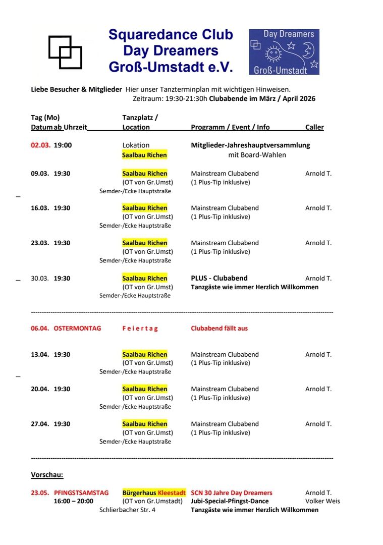 Unsere Kleiderordnung sieht für Clubabende "Proper Dress" - korrekte Kleidung - einschließlich traditioneller Squaredance Kleidung vor. Strassenschuhe, die auf dem Boden Streifen hinterlassen, bitten wir zu vermeiden.