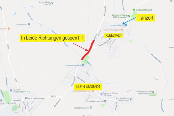 Die beschilderte Umleitung für den Durchgangsverkehr verläuft während der gesamten Baumaßnahme ab Kleestadt über die L 3065 bis Langstadt von dort über die Kreisstraße K 108 bis Harpertshausen weiter über die